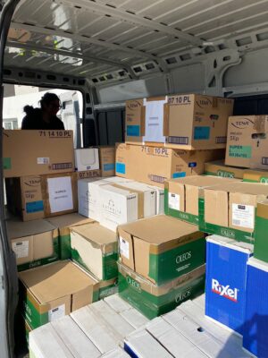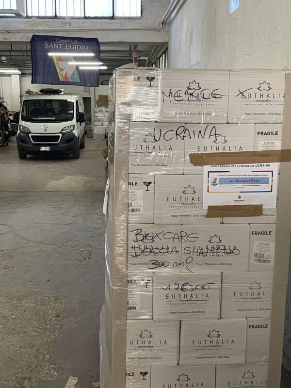 SinergicaMente interviene con una fonitura di materiale sanitario, per la pulizia e per l’igiene personale a sostegno di coloro che sono fuggiti dai disastri della guerra ed hanno trovato rifugio presso un campo profughi al confine con la Romania . Circa 600 cartoni contenenti guanti, mascherine, camici monouso, disinfettanti, prodotti per l’igiene personale e per la pulizia degli ambienti sono giunti a destinazione grazie all’aiuto e alla collaborazione della Cooperativa Giuseppe Garibaldi, della Comunità di Sant’Egidio, e dell’Associazione Mo.Da.Vi, che ha provveduto alla consegna in Romania dei mater